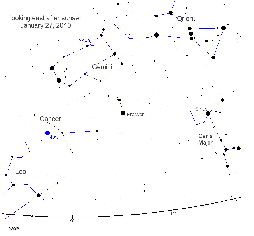 O dia 29 é o melhor para observadores, quando a Lua estará cheia e formará uma conjuntura com Marte e a constelação de Câncer. Nesta noite, Marte estará em oposição ao Sol, ou seja, em sua frente. O planeta subirá ao lado da Lua ao entardecer, nunca se afastando mais de 6º do satélite.